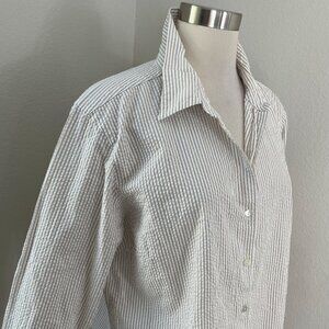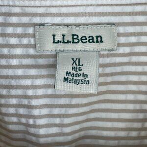 LL Bean Womens XL Seersucker Button Up Shirt Tan Striped 3/4 Sleeve Blouse