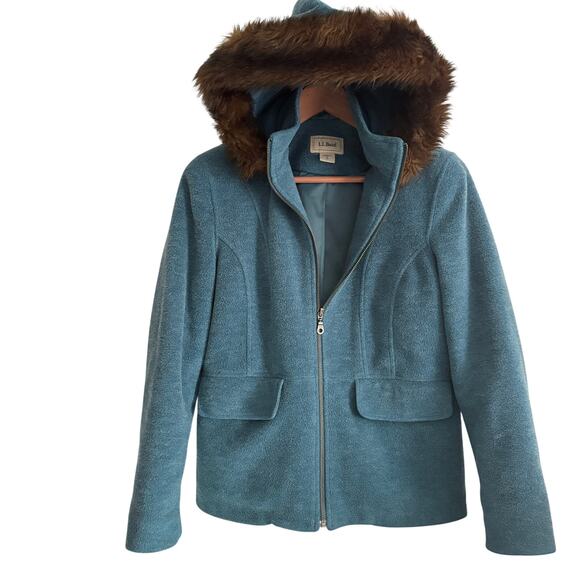 LL Bean Wool Hooded Coat S SP PS Blue Jacket Faux Fur Prep Old Money L.L. Bean