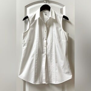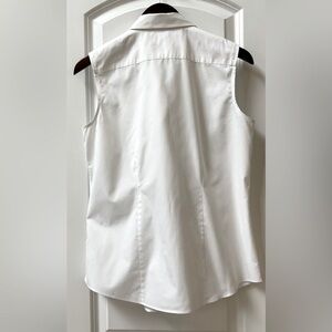 LL Bean Wrinkle Resistant Sleeveless Button Down with Pintuck detail in White. 100% Cotton, Size Small measures a 37” Chest x 26” Length. There’s a very small mark on the lower back (see last pic.), otherwise in great condition!