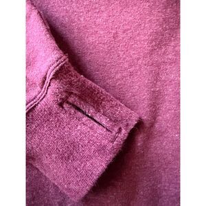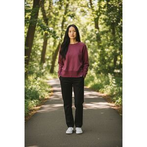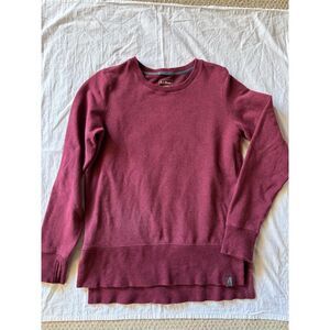 Beautiful heathered maroon cozy, soft, women's sweatshirt, thumb holes, split hem, slightly fitted and falls to below the hips. Soft blend of 59% cotton, 38% polyester and 3% spandex wicks moisture and dries quickly.