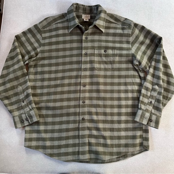 L.L. Bean Y2K Cotton Plaid Flannel Button Down Shirt. Large. Green plaid. Pre owned. No holes or stains. Fine pilling to be expected with flannel piece. Chest pocket. See photos for approximate measurements. Great for fall and winter.