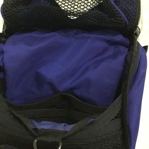 L.l. Bean small blue traveling bag, it’s used and in ok condition. The bag has inside zipper pockets with a hook to hang in the closet. It halos has inside pockets and a small mirror. The bag is new but I does have some small holes on the back as you can see. It comes from a smoke free home.