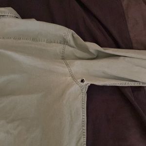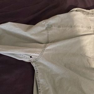 Hard to tell in the pic but it’s like a pale greenish blue color. Small tears under armpits. I’ve had this shirt for a while and never noticed them until now