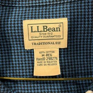 Blue with small black houndstooth button down from L.L. Bean. Traditional fit, 100% cotton, item ID 298276.