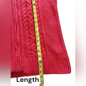 Cable knit zip up sweater in a kind of coral color. Zips up all the way, and is 100% cotton.