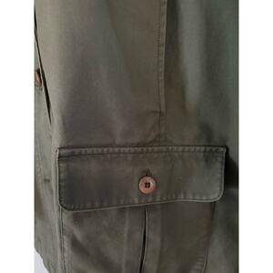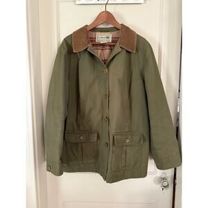 LL Bean barn jacket XL petite in green color with corduroy collar. Coat is in good condition with light fading on one pocket, shown in picture. Lined with flannel, coat is warm even into winter! Perfectly on trend for fall.