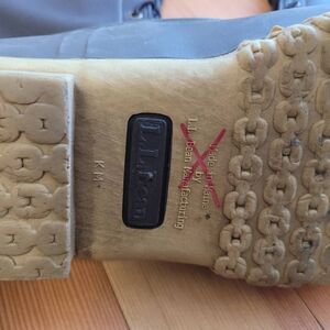 L.L. Bean Maine hunting boot rubber bottom lace up knee high says KM on the bottom indicating that they're made to wear with thicker socks. In excellent pre owned condition with minimal wear on the bottom and a loose stitch on one of the boots as shown in photos. Based on measurements I think they're a size 13, I couldn't find any other size or material tags. They retail on the official website for $199.