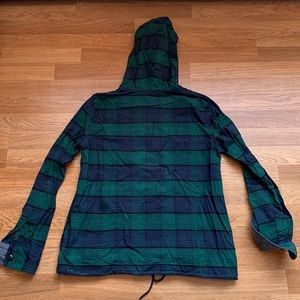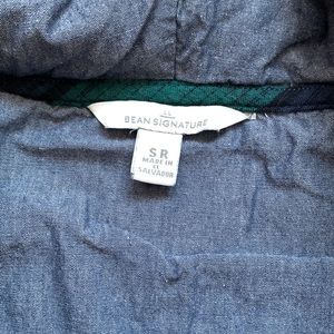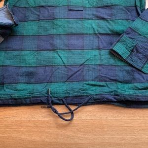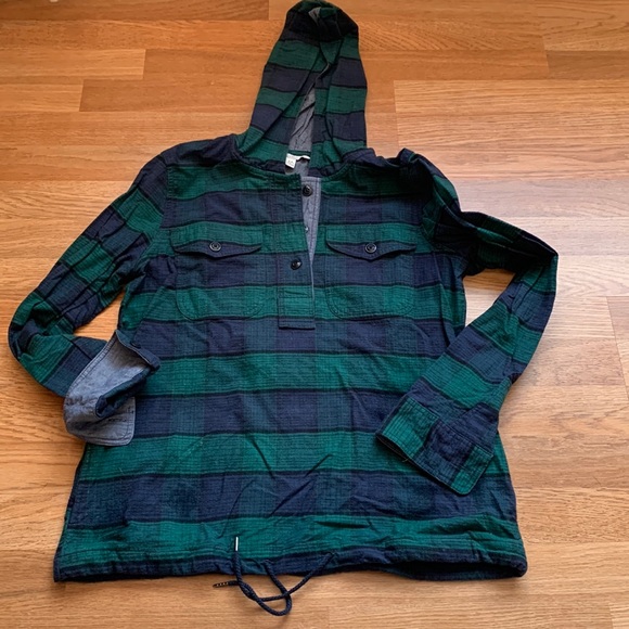 L.L. Bean Signature hooded chamois pullover. Size S. Blue and green stripe/plaid flannel/chambray. Drawstring on bottom. Only worn a few times!