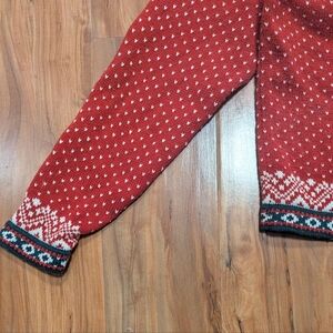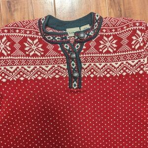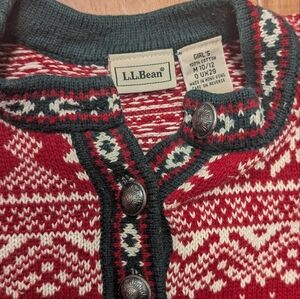 Excellent condition girl's 1/4 button down sweater. Vintage L.L. Bean with a georgous knit print. Red, and white knit pattern with green accents around the trim. A perfect holiday piece. Cabincore pullover style.