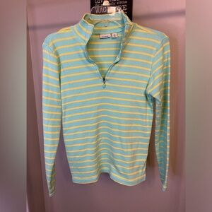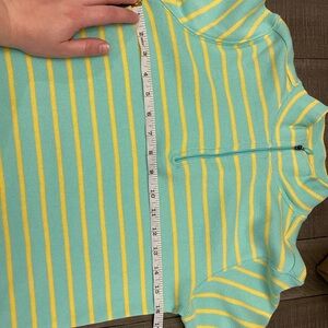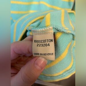 Size XS, in great condition, no stains or holes. It is a sea foam green color with yellow stripes. 100% cotton.
