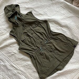L.L. Bean women’s sleeveless hooded zip front vest, women’s size large. The most practical vest! Full front zip (can zip from top and bottom) with additional snap closure, 2 chest pockets with snap closure, 2 zip inset pockets, elastic cinch at waist, fully detachable hood, 2 large inside patch pockets. So multifunctional - perfect for gardening, hiking/backpacking, any outdoor activity. Worn but excellent condition - small spot of fabric wear/rubbing at center back and some small marks on inside back hem (haven’t treated). Size large but also flattering on medium due to cinch waist. Approximate measurements seen in pics.