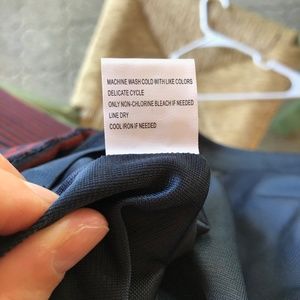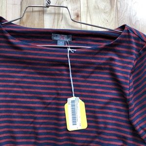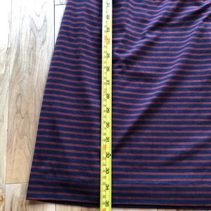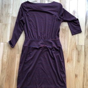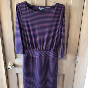 ll bean signature stretch knit dress stripe. Slightly Fitted: Softly shapes the body. Straight silhouette. Falls above knee. Hidden side zipper. Lined from the waist down. Pit to Pit-17 inches, length-35 inches Fabric & Care: 62% polyester 32% rayon/6% spandex, tailored with a bateau neckline and three-quarter sleeves. Defined at the waist in a bias-cut pattern. Machine wash and dry. Posh Ambassador, pet/smoke free home. Tag marked to prevent return to store, used for catalog photos