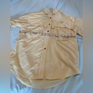 LL Bean women’s  XS Light Yellow Buzz Off Bug Repellent Long Sleeve Button Down. Mesh back. Double Velcro pockets. Button cuff sleeves. Big repellent. There are some small discoloration on the right front side. I’ve noted them in the photos. Please see pictures for measurements.
