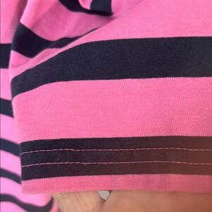 Stylish pink and black striped top for women. Perfect for casual outings. Comfortable and chic design.