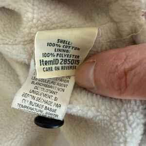 Women’s L.L. Bean, red and dark blue plaid 100% cotton button up flannel lined with 100% polyester fleece. Spare button on the inside tag. Notched hip for easy movement. $90 retail. Laying flat measures 31 inches shoulder to hem and 30 inches armpit to armpit.