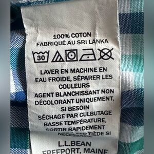 This L.L. Bean long-sleeved button-down shirt is in excellent pre-owned condition. Men’s size medium regular. Slim fit. 100% cotton. Colors are multi-shades of blue, green, and white plaid.