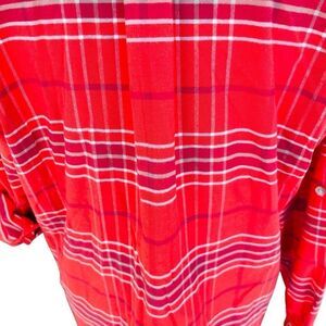 LL Bean cotton blend button front plaid tab sleeve shirt size M. Button front with two chest pockets, tab sleeve can be worn up or down with a button cuff. Shirttail bottom hem, longer in back. Cotton and polyester blend, very soft. Inside back shoulders are fleece lined.