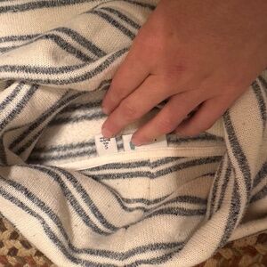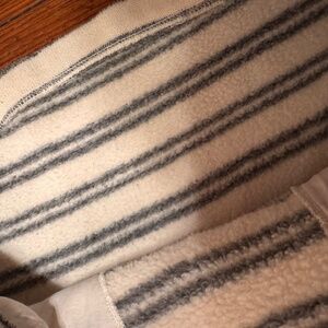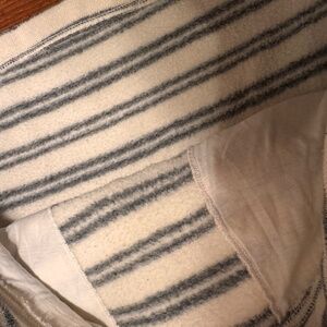 cozy and stylish with this striped cream and gray pullover with soft lining. Perfect for layering over top
