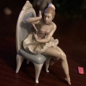 White porcelain figurine of a dancer with enamels and a contemporary dance pose with a white base attached to the piece.
