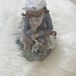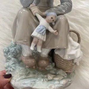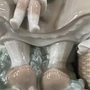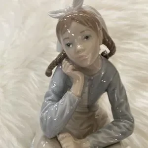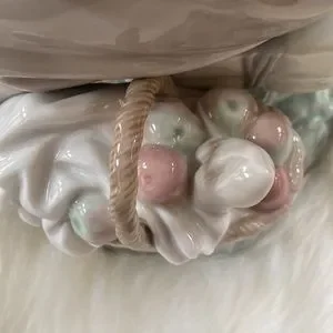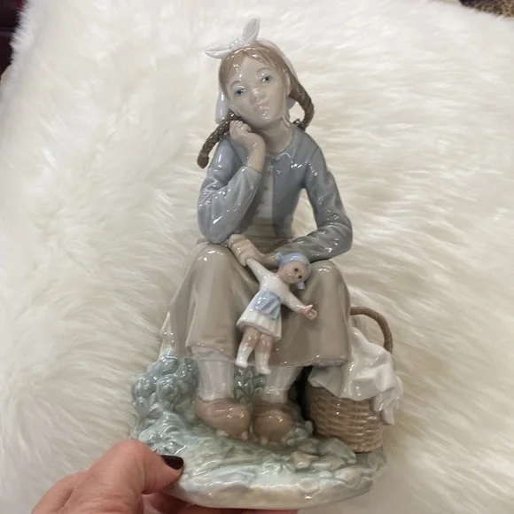 Beautiful without box retired girl with doll LLADRO. She is in perfect condition. Stored and not displayed. A beautiful young girl daydreaming holding her doll by the arm. The picnic basket is full . So special. She has lovely detailed braids and shoes look like they are from holland. Her socks are detailed with raised porch lace. Just beautiful. Just thinning my collection. Happiest shopping