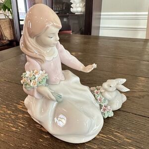 This lladro depicts a girl kneeling sideways and communicating her bunny friend.