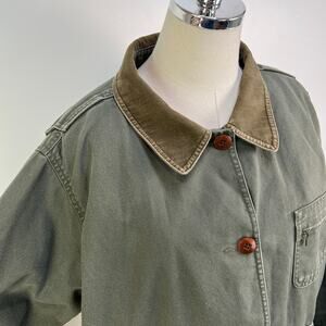 Preowned item in excellent overall condition. No odors or holes. The removable flannel plaid primaloft liner buttons in or out making this piece special. Corduroy collar and cuffs. Each front side pocket has a flap pocket. Additionally there is a zip breast pocket on the front. Has extra buttons for repairs.