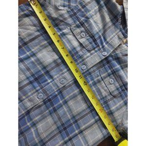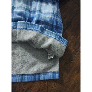 Bright Capri Plaid flannel on the outside and ultra cozy fleece on the inside, Blue and white colors , hoodie style, full button up with 2 front buttoned pockets and 2 side pockets
