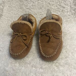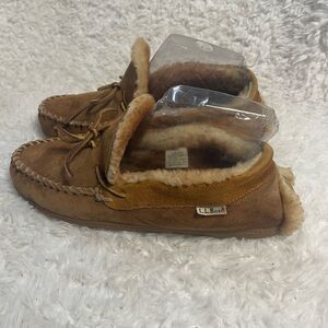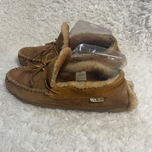 LLBean Men’s leather Suede tan Moccasin Slippers shearling lining SZ10M. Perfect for lounging..Pre owned in good used condition small transfer marks on the suede see all pictures any questions please message.M13