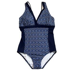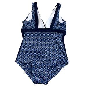 L.L.Bean One Piece Swimsuit Women’s 16 Long Blue Geometric Print V-Neck Tummy Control UPF 50+
