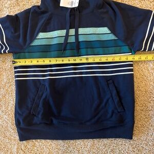 Super soft navy pullover hoodie with teal ombré stripes. The perfect cozy and retro top for the next sunset walk along the beach or campfire gathering.