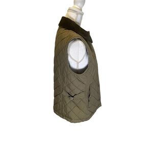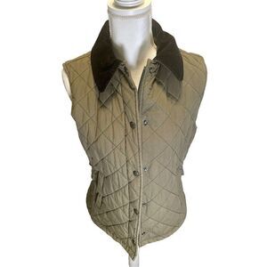 L.L. Bean women’s quilted vest in a Petite Small. Vest is olive green in color with a black corduroy collar. Full zip plus snap closure. Front pockets. Side size adjustment (see photo). Quilted all over pattern. Item measures 19.5” armpit to armpit. Vest is 25” in length from top to bottom. Item is Preloved and in good condition. Contact me with any questions.