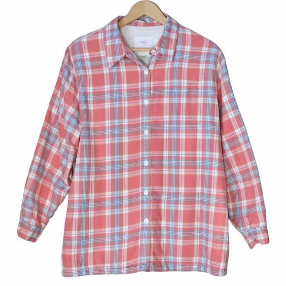 Red, blue, and white plaid button up shirt fully lined with Sherpa/faux fur (including sleeves). There is a left breast pocket and buttons at the sleeves to allow you to roll them up. The sleeves are slightly ruched. Brand: L.L.Bean Size: Large Measurements: Length - 29” Chest - 23” Sleeve - 22.5” Content + Care: - Shell: 100% cotton - Fleece lining: 100% polyester - machine wash cold Condition: - barely worn - no stains or damages