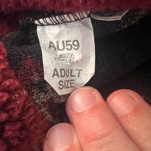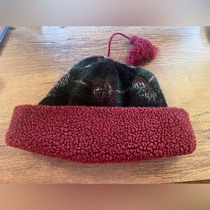 Stylish knit beanie with red and black design. Features a fun pom pom on top.