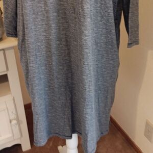 LL Bean striped dress in black and white. Loose and comfortable. V-neck. long sleeves. Pleat in back. Size XL measures 48 at chest, 52 at hips, pockets here, 58 at bottom hem. 41 long from shoulder to hem. Comfortable and stylish.