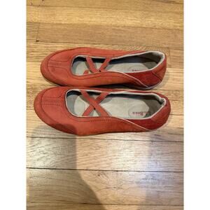 Comfort-focused L.L.Bean Mary Jane–style flats in a warm rust red / brick tone. Soft suede uppers with elastic cross straps for a secure, flexible fit. Cushioned footbed and lightweight sole make these easy to wear for everyday errands, walking, or travel.