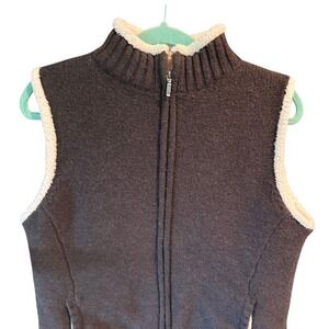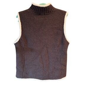 L.L.Bean Womens Lambswool Blend Knit Vest Sherpa Trim Full Zip Brown Large
