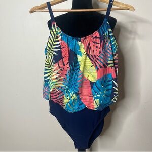 LL.Bean Women’s Multicolor Leaf Blouson Tank Shaping One Piece Swimsuit Sz L