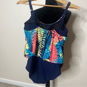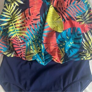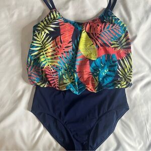 Women’s LL.Bean Orange/teal/yellow/navy palm leaf print one piece blouson tank full coverage shaping swimsuit nylon/lycra size L~P2P 16” waist 30” length 24” bust to crotch~good condition