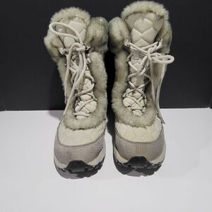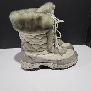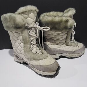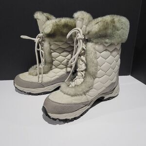 Stay warm and stylish with these quilted winter boots. Featuring a cozy faux fur lining and durable design, these cream boots are perfect for cold weather. Very mild discoloration in the front of the left boot...barely noticeable.