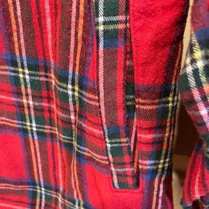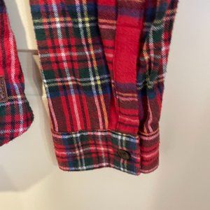 L.L.Bean Women's Scotch Plaid Flannel Shirt/Relaxed Zip Hoodie in Royal Stewart Tartan. Drawstring hood, working button cuffs at the wrist, two non-zipper pockets, and a pleat on the back. The majority of the jacket is made from a single layer of flannel fabric. There are some slightly pilled/worn spots, but overall in great used condition.