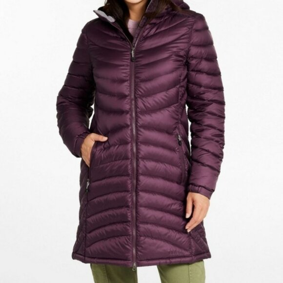 L.L.Bean Women's Ultralight 850 Down Hooded Coat, three quarter length, dark plum color, water repellent, quick drying, front zipper pockets, two way zipper closure top or bottom, packable, and weightless, size large, good conditions