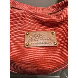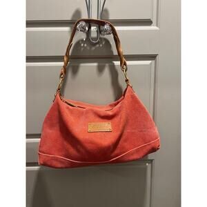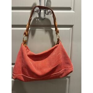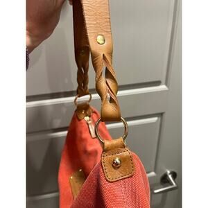 Cloth bag in good condition. Light wear on one corner. Color orange with a braided leather strap.