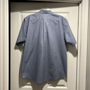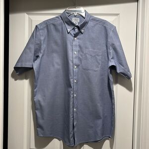 This shirt is 100% cotton, wrinkle resistant, has a small blue/white plaid. Shirt is in excellent condition!