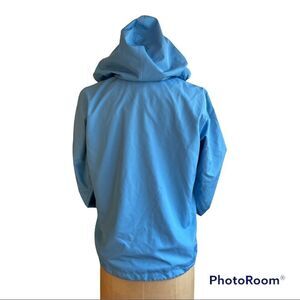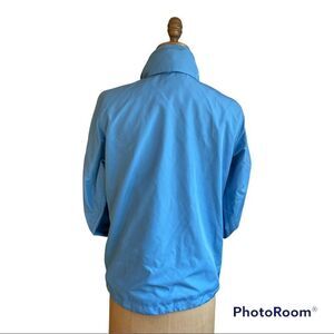 Lovely blue short lightweight windbreaker rain jacket great to stuff in your backpack, handbag, car for Spring showers. Hood can be rolled up and hidden inside the collar.
