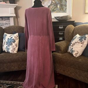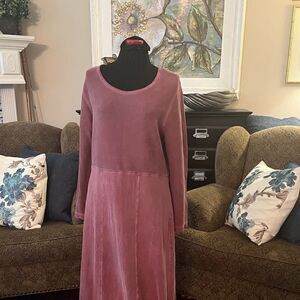 This dress is in good used condition. Has a pre wash velvet dusty rose look. The dress is heavy and good for winter with a pair of boots. Arm Pit to arm pit back 20 1/2” front 20 1/2”. It stretches the measurements are without stretching. Back of neck to hem 51 1/2”.