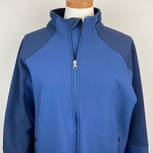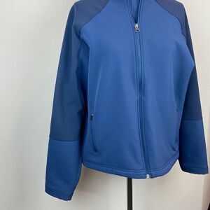 This jacket is in excellent condition. Featured with a soft shell water resistant exterior and fleece interior. Includes two zippered pockets at the waist. Navy in color and size large. Please send any offers or questions!