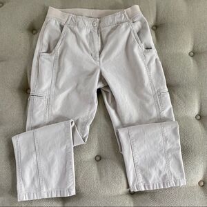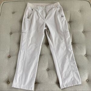 L.L. Bean classic fit pants with button and zip closure and a stretchy knit waistband for a comfortable fit. Hip pockets and two flat thigh pockets. Cotton and spandex blend. Measurements are approximate and taken while laying flat: 15 inches straight across the waist with a 10 inch rise and a 27 inch inseam