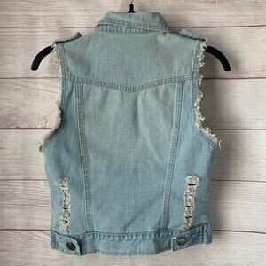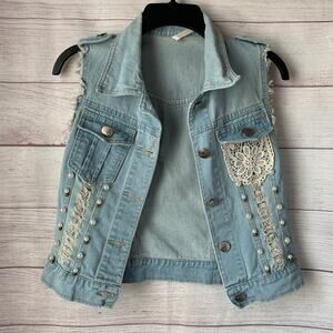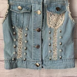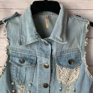 Distressed and embellished denim blue jean vest by LLOVE. This collared, light wash vest is sleeveless with fringe lining the arm holes. It has a full button up front, pockets on the chest with flap closures and decorative buttons (don't fully fasten/close), sheer distressed strips under the pockets and on the bottom back, shoulder epaulets, decorative button flaps on the bottom back, a floral sheer crocheted left pocket. and lines of bronze and white colored beads on the front. It is pre-owned, with some beads hanging loose but secure and in great condition.