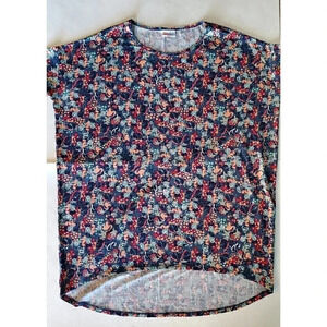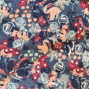 Women's LuLaRoe Irma top, featuring a high-low hemline and dolman sleeves. This top is a Disney collaboration, featuring a collage of Mickey Mouse & Minnie Mouse on a dark teal background. This top is size medium, which is a 12/14 according to the size chart, and it is meant to be worn oversized (so could fit a larger size if you want a more fitted look). Measurements are approximately 27.5" to the high front hemline, 32.5" to the low back hemline, and 26.5" from pit to pit.