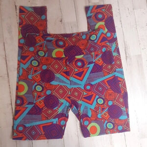 Lularoe brand One Size buttery soft leggings. Bright geometrical pattern with different shapes and colors. Some Orange, green, light blues and lime green. In good used condition with no major flaws. Washed once per LLR guidelines, some piling. All items are from a pet free, smoke free home and will ship same or next day.